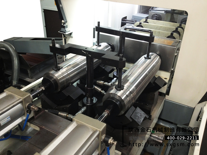 工件裝夾形式:“V”型鐵工裝,上置半圓套,液壓壓板壓緊;尾頂推動工件貼緊導向套" />