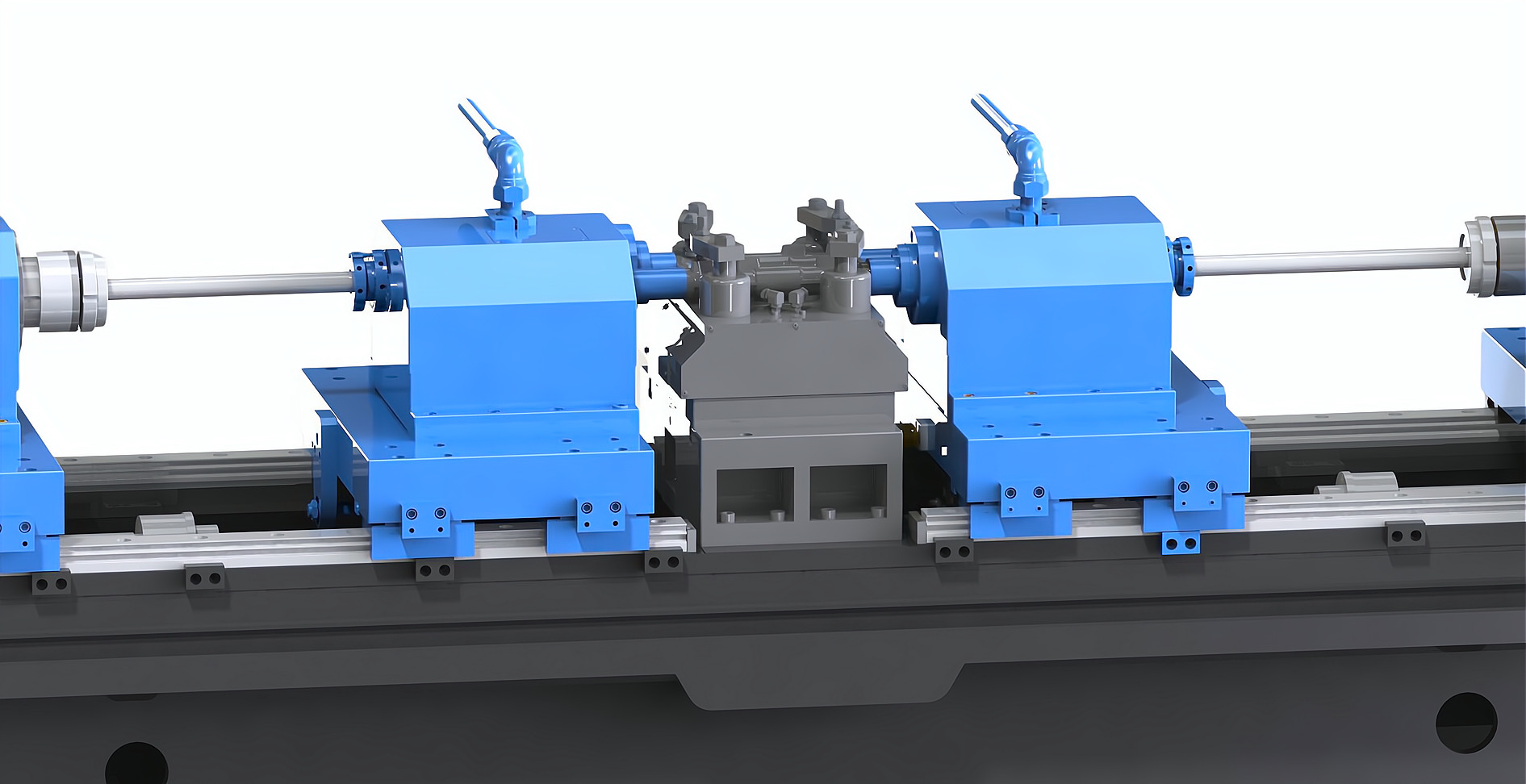 簡(jiǎn)要說(shuō)明:機(jī)床采用臥式布局,兩支鉆桿對(duì)向錯(cuò)位設(shè)計(jì),中心距94mm(可定制),刀具采用BTA單管鉆。工裝放置在機(jī)床的中間位置,液壓旋轉(zhuǎn)壓板自動(dòng)夾緊。一次裝夾,可同時(shí)對(duì)向鉆削加工完成履帶板上的2-φ32mm深孔。加工效率極高。冷卻系統(tǒng)放置在主機(jī)后面,平行放置,結(jié)構(gòu)緊湊,占地面積??;