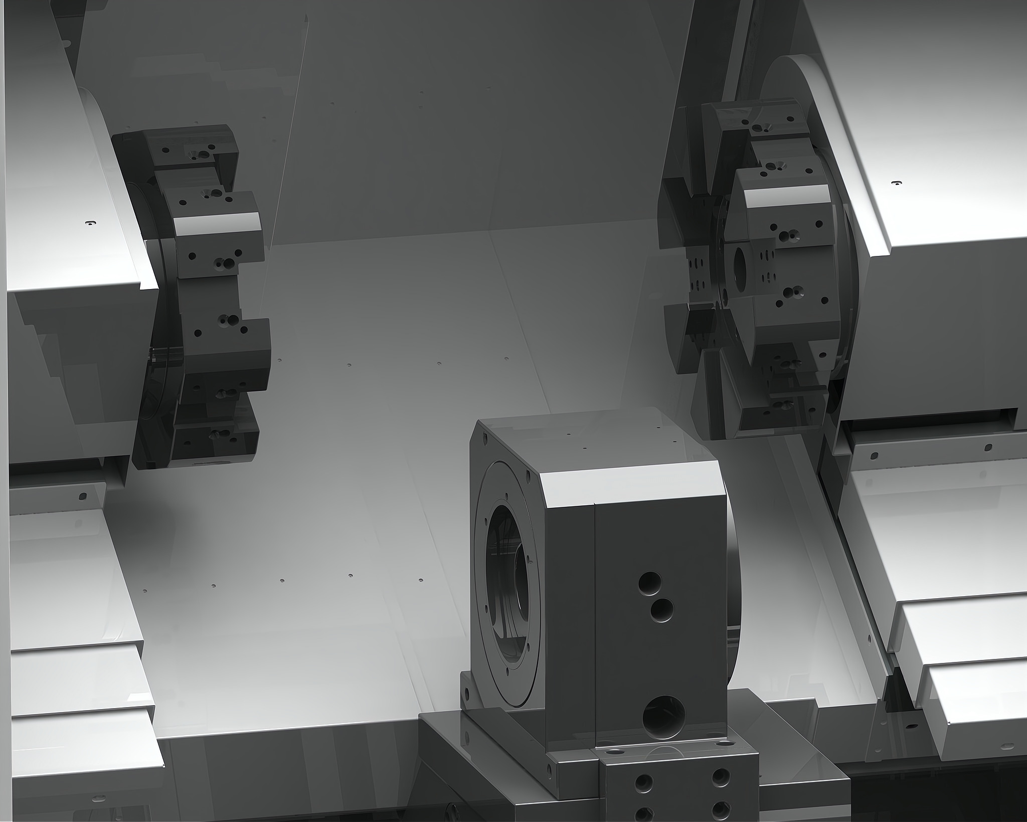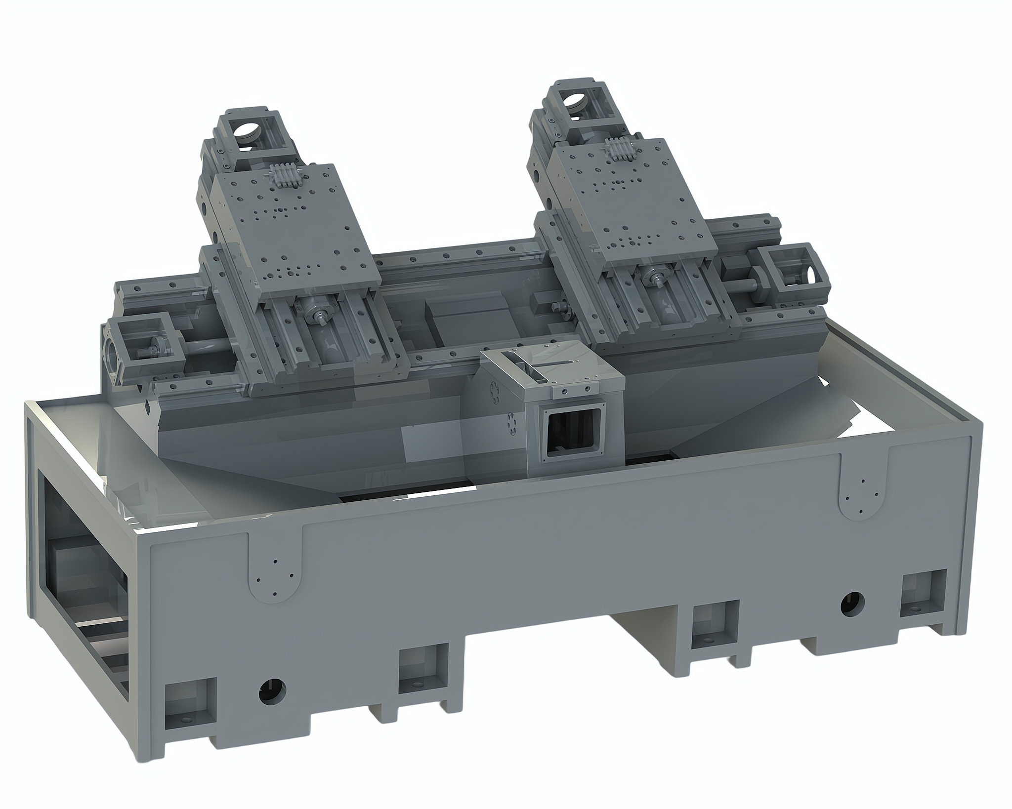 左右刀架為伺服刀塔,分布于主軸箱兩側(cè),為對(duì)稱結(jié)構(gòu);