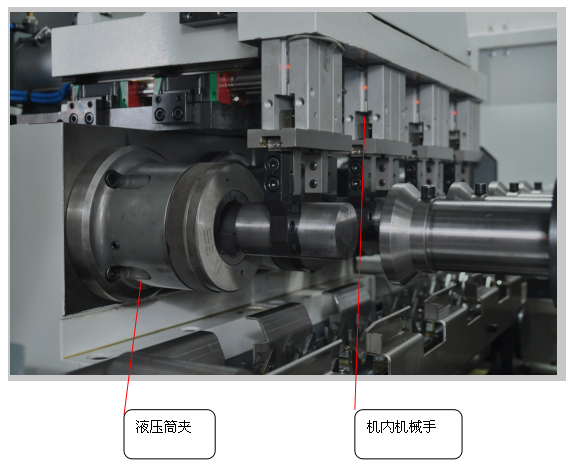 四組機內(nèi)機械手一次抓取4支工件,上升,并將工件插入筒夾內(nèi)孔;